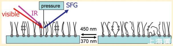 在此,我們研究了光開關(guān)脂質(zhì)DT Azo-5P(圖1)的單層,其為純的,并與脂質(zhì)1,2-二棕櫚酰-sn-甘油-3-磷酸膽堿(DPPC)混合。如圖1中的UV/vis光譜所示,光活性脂質(zhì)可分別用370和450 nm的光從其反式狀態(tài)切換到順式狀態(tài)并返回。我們將表面壓力測量與無標(biāo)簽、寬帶振動和頻率產(chǎn)生(VSFG)光譜相結(jié)合。10這些技術(shù)使我們能夠研究空氣-水界面上的脂質(zhì)分子單層。可以獲得有關(guān)脂質(zhì)與水分子相互作用的信息以及脂質(zhì)的分子結(jié)構(gòu)。在非線性光學(xué)技術(shù)VSFG中,紅外(IR)光束和可見光(VIS)光束在界面處組合,產(chǎn)生具有兩個入射光束和頻率的信號。如果紅外線與分子振動共振,信號就會強(qiáng)烈增強(qiáng)。已經(jīng)證明,這種通過分子振動的技術(shù)提供了有關(guān)脂質(zhì)分子構(gòu)象和取向的信息。11-18在中心對稱介質(zhì)中禁止和頻產(chǎn)生,因?yàn)檫@是一種二階非線性光學(xué)過程。19因此,該技術(shù)對中心對稱材料(如水表面)的最外表面分子層敏感。相反,缺少信號表明界面上的材料或分子群是中心對稱的。對于金表面偶氮苯功能化自組裝單分子膜,SFG在測定光異構(gòu)化的截面和機(jī)理方面非常有用。得出的結(jié)論是,光異構(gòu)化是由直接電子激發(fā)驅(qū)動的,類似于液相中的偶氮苯