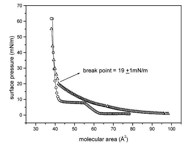 圖1.朗繆爾單分子膜的表面壓力-面積曲線:純DMPA(O)和DSAP/DMPA(1:3500,mol:mol)(4)。 曲線中顯示的斷點與混合單層的LE-LC轉變有關。