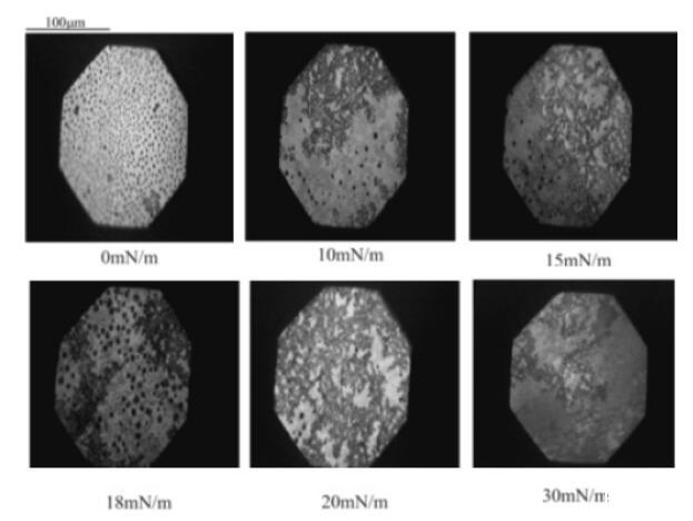 圖4.DSAP/DMPA單分子膜(1:3500,mol:mol)在幾種表面壓力下的熒光顯微照片。