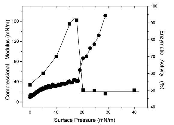 圖3.(9)在幾種表面壓力下,DSAP/DMPA(1:3500,mol:mol)混合單分子膜中DSAP的PNPPA酶活性。(b)DSAP/DMPA混合單分子膜的壓縮模量。酶活性表示為均相介質中估計值的百分比。