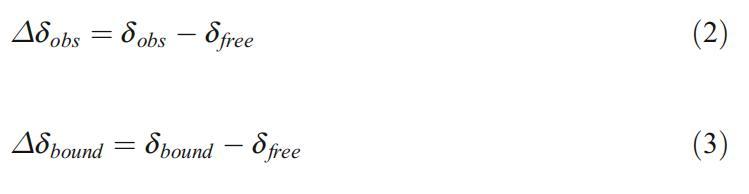 在任何給定的α-環(huán)糊精濃度下,結合表面活性劑分子的分數(shù)都可以通過其信號的化學位移來確定。客體分子在束縛態(tài)(δ束縛態(tài))和自由態(tài)(δ自由態(tài))有不同的化學位移。在自由形式和束縛形式之間的平衡以及這兩種狀態(tài)之間的交換率(比共振頻率差快)的情況下,將僅觀察到一個具有觀測到的化學位移(δobs)的信號,即δ束縛和δ自由之間的加權平均數(shù)。對于以下內容,我們定義了觀察到的化學位移變化(?δobs)和結合時化學位移的變化(?δ界):