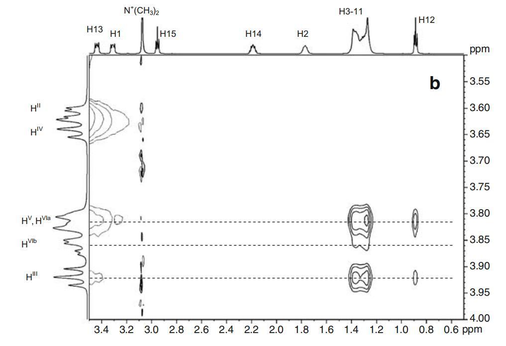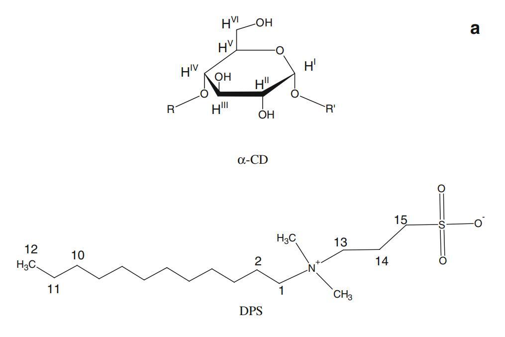 圖7α-CD(所示為一個吡喃葡萄糖苷單元)、DPS和Mega-10的示意圖。表面活性劑和α-CD的2D-ROESY光譜的關注區域。阿拉伯數字表示表面活性劑原子,而羅馬數字表示CD原子。b為DPS-α-CD系統。Mega-10-α-CD系統的c