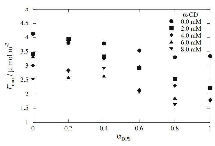 式中,γ、C、R、T和P為界面張力、表面活性劑濃度、理想氣體常數、溫度和壓力。純系統和混合系統的Γmax值如圖4所示。純Mega-10和DPS分子的Γmax值與文獻報道的值一致[26,28]。圖4顯示Mega-10的Γmax值略高于DPS。這一結果表明,與DPS相比,Mega-10分子在空氣-水界面以更緊湊的形式排列。兩種表面活性劑的Γmax值隨著α-CD量的增加而減小,表明表面活性劑物種從界面上的解吸(圖4)。這種行為是表面活性劑與α-CD之間存在相互作用的另一個證據。對于Mega-10和DPS在不同DPS摩爾分數(αDPS)下的二元混合物,Γmax值隨著DPS量的增加而減小,表明DPS在界面上吸附后形成混合單層。