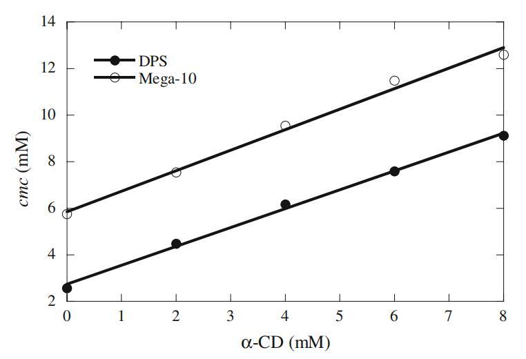圖3 Mega-10和DPS cmc依賴于α-CD濃度的曲線圖