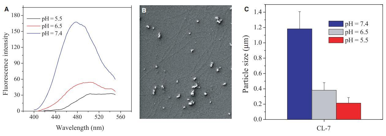 圖6:(A)pH值影響不同pH值下溶液(40 lM)中CL-7的聚集。1-苯胺基萘-8-磺酸(1,8-ANS)濃度固定在20 lM,激發(fā)波長(zhǎng)設(shè)置為369 nm。肽聚集溶解通過(guò)1,8-ANS發(fā)射峰在500 nm處的紅移和熒光強(qiáng)度降低來(lái)指示;(B)pH=7.4的40 lM肽溶液中形成的CL-7聚集體的掃描電子顯微鏡圖像;(C)隔夜培養(yǎng)后測(cè)量溶液中肽CL-7(80 lM)的粒徑。數(shù)據(jù)代表至少三個(gè)獨(dú)立測(cè)試的平均值和標(biāo)準(zhǔn)差。