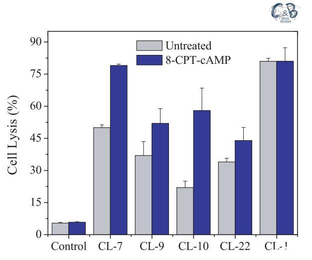 為了排除上述結(jié)果由CHO-K1細(xì)胞的某些固有特性引起的可能性,我們?cè)诹硪粋€(gè)選定的細(xì)胞A549上進(jìn)行了相同的實(shí)驗(yàn),其細(xì)胞表面電荷與CHOK1細(xì)胞幾乎相同(表1)。由于肽將受到來(lái)自A549和CHO-K1細(xì)胞的相同拉力,靜電吸引對(duì)肽-細(xì)胞相互作用的潛在影響被最小化或消除。A549細(xì)胞的表面pH值為7.15,高于肽CL-9、CL-10和CL-22的過(guò)渡pH值,但低于肽CL-7的過(guò)渡pH值(pH值為7.35)。同樣,CL-7被證明是A549細(xì)胞上最活躍的肽(圖3)。在存在8-CPT-cAMP的情況下,A549細(xì)胞的表面pH值降低至pH=6.55(表3),低于所有受試裂解肽的過(guò)渡pH值(表1)。因此,四種pH敏感裂解肽對(duì)8-CPTcAMP處理的A549細(xì)胞的裂解活性顯著增加(圖3)。應(yīng)注意的是,與pH敏感肽不同,當(dāng)細(xì)胞被8-CPT-cAMP處理時(shí),pH不敏感肽CL-1對(duì)A549和CHO-K1細(xì)胞的活性幾乎沒(méi)有變化(圖2和圖3)。