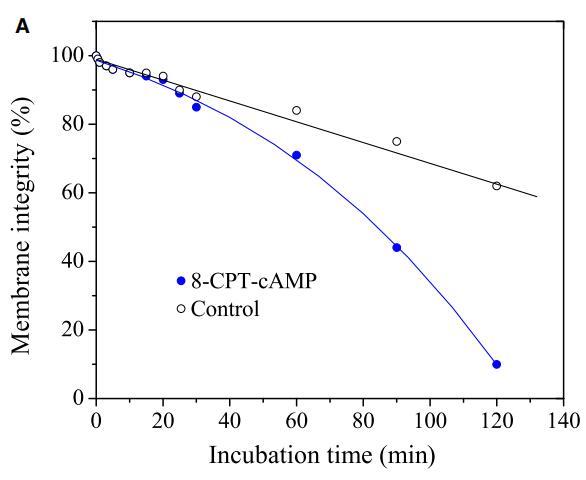 肽與細(xì)胞膜的相互作用包括三個(gè)步驟:(i)陽(yáng)離子肽對(duì)細(xì)胞表面的靜電吸引;(ii)肽向結(jié)合平面的轉(zhuǎn)變;(iii)將肽插入細(xì)胞膜。通過(guò)研究pH敏感肽CL-7誘導(dǎo)的膜損傷動(dòng)力學(xué),研究了肽-細(xì)胞相互作用的細(xì)節(jié)(圖5A)。CL-7誘導(dǎo)的A549細(xì)胞膜滲漏呈時(shí)間依賴性,并呈線性曲線。盡管在8-CPT-cAMP處理的A549細(xì)胞上,CL-7介導(dǎo)的細(xì)胞膜損傷在開(kāi)始時(shí)遵循相同的曲線,但它偏離了線性曲線,并在培養(yǎng)15-20分鐘后加速(圖5A)。在脂質(zhì)單層膜上進(jìn)行的平行膜張力研究表明,CL-7與細(xì)胞膜的相互作用以表面張力快速增加的初始階段為特征,隨后是表面張力松弛的第二階段(圖5B),與肽與膜結(jié)合和肽插入相關(guān)膜,分別。盡管CL-7與脂膜結(jié)合是一個(gè)快速過(guò)程(3-5分鐘),但肽插入脂膜大約需要20分鐘才能完成。這兩個(gè)實(shí)驗(yàn)的結(jié)果非常吻合,這意味著細(xì)胞表面pH對(duì)CL-7的顯著影響發(fā)生在肽-細(xì)胞相互作用的后期,即肽插入細(xì)胞膜。