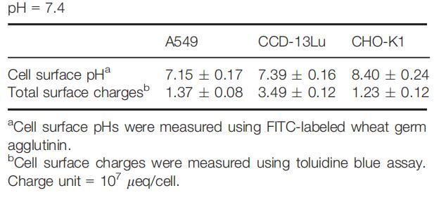 雖然細(xì)胞外環(huán)境通過(guò)影響細(xì)胞表面和整體溶液之間的質(zhì)子交換而影響細(xì)胞表面pH值,但在pH值固定的生理?xiàng)l件下,細(xì)胞表面pH值將由細(xì)胞的化學(xué)和生物學(xué)特性決定,包括細(xì)胞的質(zhì)子生產(chǎn)能力、細(xì)胞大小、細(xì)胞的大小、細(xì)胞的大小、細(xì)胞的大小、細(xì)胞的大小、細(xì)胞的大小、細(xì)胞的大小、細(xì)胞的大小、細(xì)胞的大小以及細(xì)胞的大小,以及細(xì)胞表面的pH緩沖能力。因此,在生理?xiàng)l件下,組織細(xì)胞可能具有特定的甚至可區(qū)分的表面pHs。我們測(cè)量了一組來(lái)自不同器官/組織的細(xì)胞在生理pH下的細(xì)胞表面pH值,發(fā)現(xiàn)所有受試細(xì)胞都具有不同的表面pH值(表1)。
