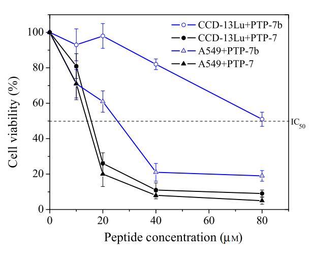 在細(xì)胞毒性研究中,選擇了研究充分的pH敏感裂解肽PTP-7b(FLGALFKALSHL)(6,9)。由于PTP-7b的過(guò)渡pH(pH=7.25)低于A549的表面pH,但高于CCD-13Lu,因此裂解肽PTP-7b對(duì)A549的毒性可能比對(duì)CCD-13Lu細(xì)胞的毒性更大。選擇PTP-7b的親本肽PTP-7(FLGALFKALSKLL),一種pH不敏感的裂解肽(6,9)作為對(duì)照。如圖8所示,盡管肽PTP-7對(duì)兩種細(xì)胞的活性相同,但pH敏感肽PTP-7b對(duì)A549的毒性大約是對(duì)CCD-13Lu的三倍。