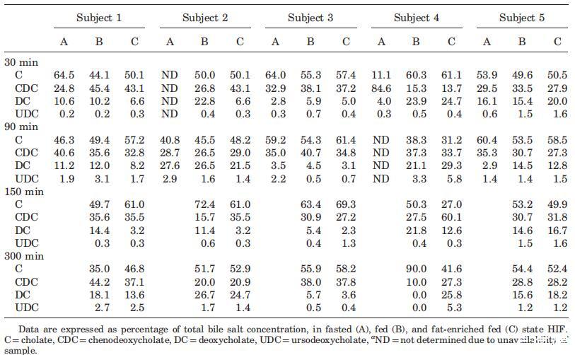 盡管在較低程度上,當檢查受試者的膽汁鹽池成分時,也觀察到了一種可變模式(表3)。膽酸鹽和鵝去氧膽酸鹽(結合膽汁鹽和未結合膽汁鹽之和)至少占總膽汁鹽庫的65%,脫氧膽酸鹽和熊去氧膽酸鹽(結合膽汁鹽和未結合膽汁鹽之和)雖然含量較少,但在每個樣本中都發現。文獻報道了禁食狀態HIF膽汁鹽池成分的主體間變異性。2,24在這些研究中,變異性主要是由于膽鹽與甘氨酸或牛磺酸結合,因為未結合的膽鹽僅占總膽鹽庫的不到3%。研究發現,隨著時間的推移,個體內膽汁鹽組成以及營養狀態之間的一致性相對較高,很少排除異常值(表3)。例如,對于S3和S5,在三種營養狀態下,在整個取樣時間內,相對膽鹽組成相當一致,而對于S4,膽酸的分數在38%和90%之間變化(表2)。