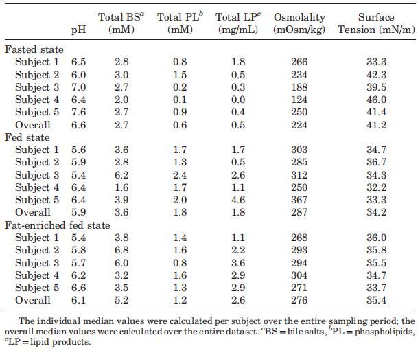 當考慮五個不同的受試者時,總膽汁鹽濃度隨時間的變化在所有三種營養狀態下都呈現波動模式(圖3)。無法定義可應用于每個單獨圖表的清晰的濃度-時間曲線。文獻中也報道了喂食條件下膽汁鹽濃度的高度變化。可以找到高達37 mM27和低至0.5 mM33的值;然而,文獻中觀察到的典型膽鹽濃度約為10mm,在進食后30–60分鐘檢測到。11,12,19,33在本研究中,攝入Sure Plus1后30分鐘,膽汁鹽濃度中值為8.3 mM;在高脂肪喂養狀態下,30分鐘后獲得的中值為11.9 mM。這些中值與文獻中觀察到的典型值一致。相比之下,五名登記受試者的單獨匯集腸道樣本顯示,在兩種喂養狀態下,總膽汁鹽濃度均低于5.3 mM。同樣在禁食狀態下,當不存在膽囊收縮刺激時,可以看到高度可變和時間依賴性的膽鹽濃度:濃度范圍為0.3至9.6 mM(圖3)。Lindahl等人的一項研究也描述了類似的高變異性。34作者報告了24名志愿者的禁食狀態膽鹽濃度,范圍在0.1至13.3 mM之間,總收集時間為150分鐘。Brouwers等人2和Perez de la Cruz Moreno等人24也報告了禁食狀態下的膽鹽濃度單個志愿者的小腸,分別為1.0至5.3 mM和0.5至5.5 mM。使用當前數據集計算的個體膽汁鹽濃度中位數顯示出較小的受試者間變異性,最小值為2.0 mM,最大值為3.0 mM;總體中值為2.6 mM(表2)。這些中值與禁食狀態下報告的膽鹽水平相當吻合:之前的文章描述了禁食狀態下總膽鹽濃度在2.0和5.9mm之間。11–13,19與當前設置中采用的120分鐘的總取樣周期相反,在后述報告中使用單時間點測定來評估空腹水平。11–13,19