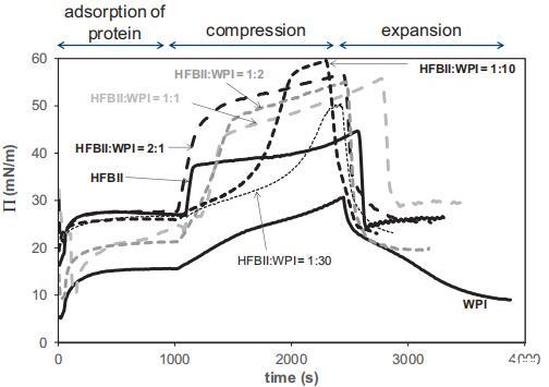 圖1。純蛋白質(zhì)系統(tǒng)WPI(右)和HFBII(左)以及口糧WPI:HFBII為10:1、3:1、1:1、1:3和1:10的混合系統(tǒng)的表面壓力等溫線(xiàn)。
