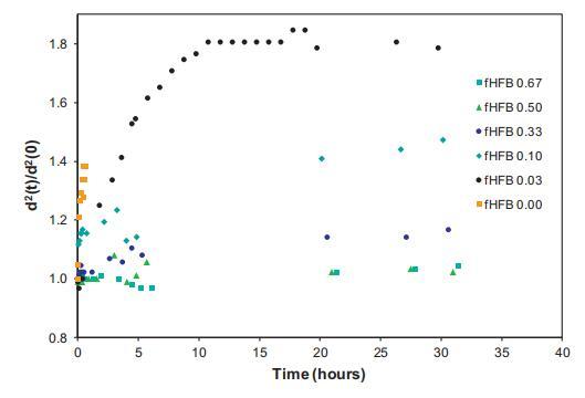 氣泡尺寸隨時(shí)間的相對(duì)增加如圖9所示,表示為d2(t)/d2(0)。考慮到環(huán)境充氣樣品的泡沫穩(wěn)定性,對(duì)于純HFBII系統(tǒng),在本實(shí)驗(yàn)期間未發(fā)現(xiàn)平均氣泡尺寸的顯著變化,表明幾乎不可能發(fā)生任何歧化。在純WPI的情況下,可以發(fā)現(xiàn)氣泡尺寸急劇增加,表明對(duì)歧化的穩(wěn)定性較差。在混合情況下,隨著fHFBII的增加,我們可以看到氣泡尺寸穩(wěn)定性增加的趨勢(shì)。我們可以粗略地說(shuō),當(dāng)fHFBII<0.2時(shí),氣泡大小的初始演化在很大程度上取決于WPI。然而,當(dāng)fHFBII>0.2時(shí),HFBII的存在控制泡沫穩(wěn)定性。這與在朗繆爾槽中觀(guān)察到的初始?xì)馀荽笮『臀綄拥内厔?shì)非常一致。