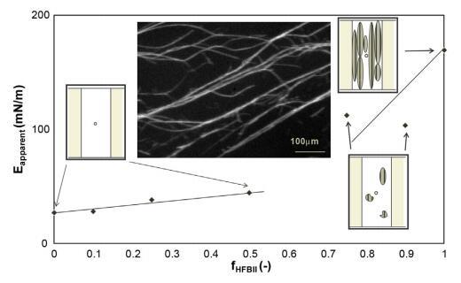 圖2。表觀(guān)模量作為擴(kuò)散層HFBII分?jǐn)?shù)的函數(shù),以及槽屏障之間界面上褶皺斑塊的圖示。右邊是純HFBII層的一個(gè)褶皺斑的顯微鏡照片。