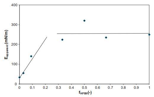 為了便于比較,從圖1的數(shù)據(jù)中,使用表面壓力第一次上升的斜率(由第一次壓縮產(chǎn)生)和公式E=(?2)提取了表觀(guān)膨脹模量(E)??1)/ln(A1/A2)。曲線(xiàn)的斜率總是在表面壓力在15到25 mN/m之間波動(dòng)的表面積范圍內(nèi)確定的。圖2顯示了表觀(guān)模量作為混合比的函數(shù),表示為HFBII分?jǐn)?shù)fHFBII=cHFBII/(cHFBII+cWPI)。