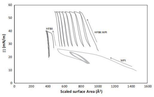 圖4。?/A-純HFBII、純WPI及其1:10混合物的吸附系統(tǒng)的等溫線(xiàn),所有這些系統(tǒng)的總蛋白質(zhì)濃度均為0.1 mg/ml。等溫線(xiàn)包括第一個(gè)壓縮/膨脹循環(huán)和5個(gè)滯后環(huán)。將HFBII和WPI的表面積縮放至攤鋪系統(tǒng)曲線(xiàn)中彎曲點(diǎn)的出現(xiàn),對(duì)應(yīng)于表面的明顯緊密堆積過(guò)渡(圖1)。