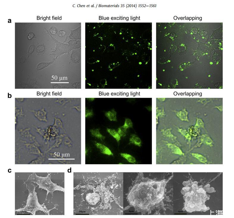 圖3。肽的原位定位和質膜完整性。(a)用10mM FITC-G(IIKK)3I-NH2孵育1h后HeLa細胞中的肽位置。(b)用10mM FITC-G(IIKK)3I-NH2孵育24h后HeLa細胞中的肽位置。(c)未經處理的HeLa細胞的代表性SEM顯微照片。(d)用10mM G(IIKK)3I-NH2處理24小時的HeLa細胞的代表性SEM顯微照片。