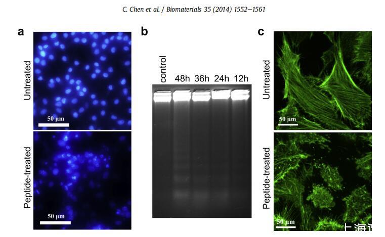 染色質凝聚與DNA片段化平行是用于識別細胞凋亡的可靠標準[21]。通過對細胞進行DAPI染色,我們首先比較了在37C溫度下用10 mM G(IIKK)3I-NH2處理24小時前后HeLa細胞的細胞核變化(圖4a)。未經處理的HeLa細胞的細胞核形態規則且完整,彌漫性DAPI染色。相反,隨著熒光強度的增加,肽處理的細胞核形狀發生改變,染色質聚集成不規則的致密團塊。此外,在不同的培養時間從處理過的HeLa細胞中提取基因組DNA,然后通過瓊脂糖凝膠電泳進行分析。孵育12小時后,出現寡核苷酸大小的DNA片段,并且隨著孵育時間的增加,模式變得更加明顯(圖4b)。相比之下,從未經處理的HeLa細胞中分離的DNA條帶是單一的,沒有發生DNA斷裂。有人提出,一旦染色質完整性受損,一些激活酶(如內源性核酸酶)負責將染色質DNA切割成180e200 bp的片段及其整數倍[22e 24]。