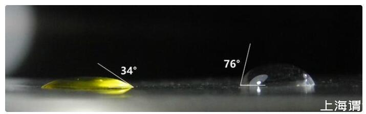 油滴(左)與水滴(右)在塑料袋上形成的接觸角。拍攝者:LePtC