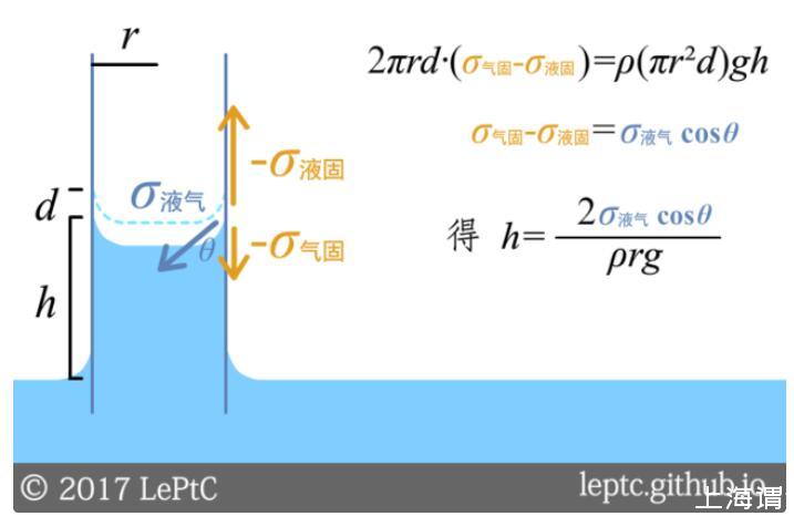 講到這里,我們已經有三種方法來解釋這個現象了:①水想增加自己跟玻璃管內壁的接觸面積,直到表面能的消耗不足以補償重力勢能;②固液接觸面的負張力把液體向上拉;③凹液面會降低液體內的壓強,從而外部氣壓把液體壓上來。三種方法都能推導出相同的結論,下圖中給出了第一種推法。