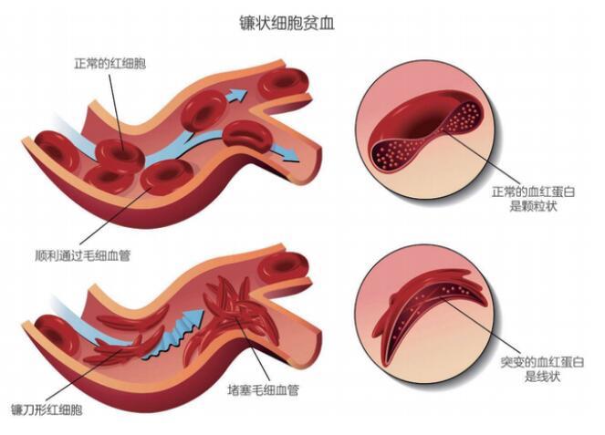 我們的紅細(xì)胞原本是中間略扁的圓餅形,這下卻被又長又硬的突變血紅蛋白凝聚物撐成了鐮刀形,不但運(yùn)輸氧氣的能力大幅下降,還會(huì)卡在毛細(xì)血管的拐彎處,形成大范圍的栓塞,肝臟、脾臟、紅骨髓等毛細(xì)血管豐富的組織都將受到嚴(yán)重的損傷。所以,那些從父母雙方繼承的基因都有這個(gè)突變的“純合”患者,常常會(huì)有生命危險(xiǎn)。