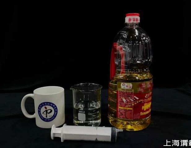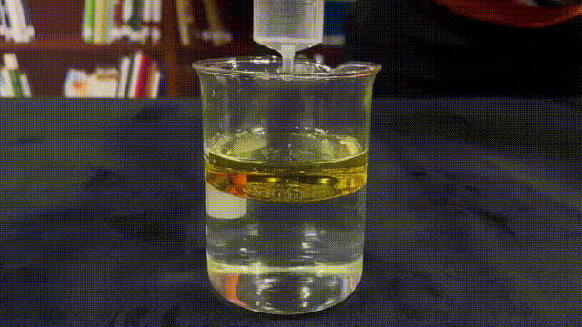 首先,我們沿杯壁向盛有水的燒杯中加入食用油,使水油有一個干凈的界面