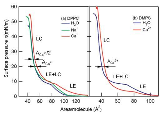 圖2:DPPC(A)和DMPS(b)在不同亞相上的壓力面積(π-A)等溫線:凈水(藍色)、1 M NaCl溶液(綠色)、1 M CaCl2溶液(紅色)。沿等溫線顯示了液相膨脹相(LE)、液相凝聚相(LC)和兩相共存區(LE+LC)。ACa2+代表鈣離子的面積。