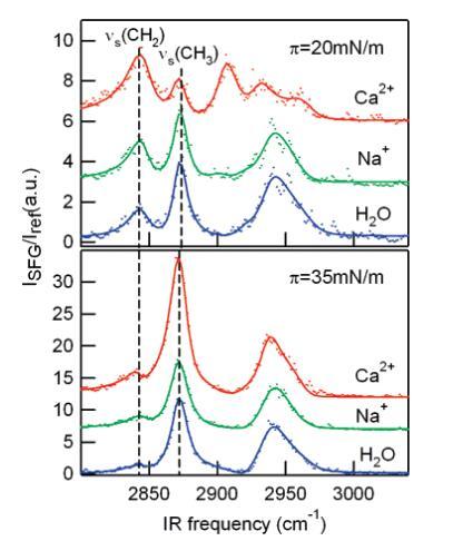 振動和頻發生光譜學(VSFG)。VSFG是一種非線性振動光譜技術,可提供界面分子構象順序和方向的表面特定信息,進一步研究了在Ca2+存在下這種改變相行為的分子起源。21,22為了量化離子對脂質尾部構象的影響,在C-H拉伸區域收集VSFG光譜。沿等溫線測量了幾個表面壓力的光譜;圖5顯示了DPPC單層在20 mN/m和35 mN/m下三種不同亞相的光譜。可以觀察到五種振動模式:以2876、2970和2938 cm-1為中心的峰值分別歸屬于CH3對稱拉伸、CH3反對稱拉伸和CH3費米共振。22 CH2對稱和反對稱拉伸頻率約為2846和2920 cm-1。氘化DPPC脂質單層(d62和d75 DPPC)上的VSFG實驗顯示膽堿C-H伸展的信號非常低。
