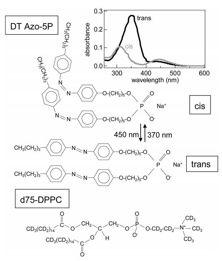 圖1:。順式和反式構(gòu)型的光開(kāi)關(guān)脂質(zhì)DT Azo-5P和d75 DPPC的分子結(jié)構(gòu)。右上角的插圖顯示了CHCl3中DT Azo-5P的紫外/可見(jiàn)光譜(~在370 nm(順式)和450 nm(反式)下輻照約10 s后,使用7μM,1 cm反應(yīng)杯)。