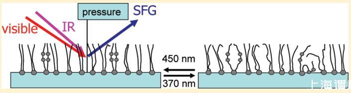 在此,我們研究了光開(kāi)關(guān)脂質(zhì)DT Azo-5P(圖1)的單分子膜,該單分子膜是純的,并與脂質(zhì)1,2-二棕櫚酰-sn-甘油-3-磷酸膽堿(DPPC)混合。如圖1中的紫外/可見(jiàn)光譜所示,光活性脂質(zhì)可分別在370 nm和450 nm的光照下從其反式狀態(tài)切換到順式狀態(tài)并返回。我們將表面壓力測(cè)量與無(wú)標(biāo)簽、寬帶振動(dòng)和頻產(chǎn)生(VSFG)光譜相結(jié)合。這些技術(shù)使我們能夠研究空氣-水界面上的脂質(zhì)分子單層??梢垣@得有關(guān)脂類(lèi)與水分子相互作用的信息以及脂類(lèi)的分子結(jié)構(gòu)。在非線(xiàn)性光學(xué)技術(shù)VSFG中,紅外(IR)光束和可見(jiàn)光(VIS)光束在界面處組合,產(chǎn)生具有兩個(gè)入射光束和頻率的信號(hào)。如果紅外與分子振動(dòng)共振,信號(hào)就會(huì)強(qiáng)烈增強(qiáng)。研究表明,這種通過(guò)分子振動(dòng)的技術(shù)可以提供有關(guān)脂類(lèi)分子構(gòu)象和取向的信息。11-18和頻產(chǎn)生在中心對(duì)稱(chēng)介質(zhì)中是被禁止的,因?yàn)樗且粋€(gè)二階非線(xiàn)性光學(xué)過(guò)程。19因此,該技術(shù)對(duì)中心對(duì)稱(chēng)材料(例如水表面)的最外表面分子層敏感。相反,缺少信號(hào)表明界面上的材料或分子基團(tuán)是中心對(duì)稱(chēng)的。對(duì)于金表面偶氮苯功能化的自組裝單分子膜,SFG在確定光異構(gòu)化的截面和機(jī)理方面非常有用。得出的結(jié)論是,光異構(gòu)化是由直接電子激發(fā)驅(qū)動(dòng)的,類(lèi)似于液相中的偶氮苯。3我們將表明,通過(guò)切換光脂,可以可逆地控制脂質(zhì)的表面壓力和分子順序。在同時(shí)含有光脂和脂質(zhì)DPPC的混合單分子膜中,我們可以通過(guò)光學(xué)切換偶氮苯基脂質(zhì)來(lái)控制DPPC的順序。這為體外控制脂質(zhì)-脂質(zhì)相互作用提供了一種新的手段。