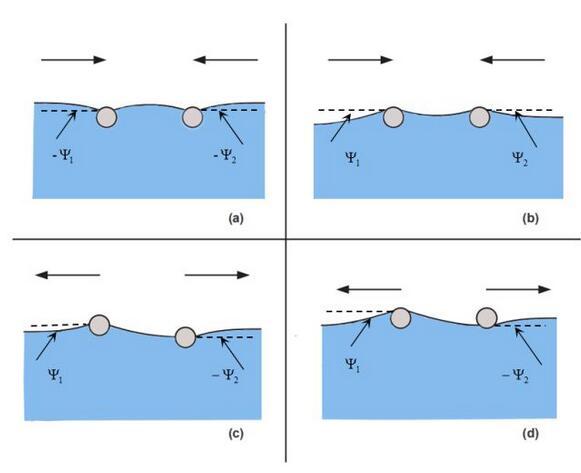 上圖便是水上兩個漂浮小球的吸引與排斥的判斷方法。值得注意的是,我們這里并沒有提及小球的浸潤性,也就是說,浸潤性與橫向毛細力的性質并不直接相關。實際上,橫向毛細力還可以分為漂浮橫向毛細力和浸沒橫向毛細力。我們討論的情況是漂浮橫向毛細力,由小球的重力引起,題主的所說的浸潤性應該換為小球的輕重(與水相比)。例如圖(a)里是兩個比水重的小球,表面張力將其往上拉。圖(b)是兩個比水輕的小球,表面張力將其往下拉。表面張力的方向恰好就對應了前述接觸線處液面的傾斜角。題主的所要表達的意思其實是: