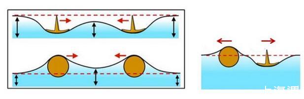 麥片圈效應中使得麥片相互吸引的因素是麥片之間的橫向毛細力(Lateral Capillary Force),橫向毛細力可分為吸引力和排斥力,這里表現為吸引力。我們通過一個簡單的例子,來說明一下橫向毛細力產生的原因。首先考慮單個小球放置在液面上保持平衡,意即在重力的作用下對液面形成一個擾動,此時若液面上存在另外一個小球時,這種擾動會相互疊加,下圖中的液面便是最終的擾動狀態。
