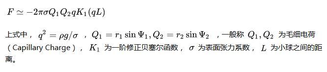 從能量的角度來看,液體表面能并不是由獨立放置單個小球時液面表面能的簡單相加,還要加上一項因另外一個小球存在時的相互表面能,其與小球之間的距離直接相關。這種相互表面能表現為沿小球連線方向的橫向毛細力。