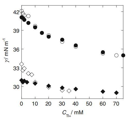 由于LAS的反陽離子?我們研究了鉈陽離子(Tl+)的加入對界面張力的影響。賤金屬的鉈作為單價陽離子存在于水溶液中,其離子化傾向在Na+和H+之間,因此它形成了比Na+更強的離子對,而且Tl+在界面上的吸附量也比Na+。添加Tl2SO4后,在pH 5.5和8.0下測量了SLA的界面張力(圖6),其中界面應首先被H+LAS覆蓋?和Na+LAS?,分別地已在cmc的兩側檢查了反陽離子的影響,即,對于pH 5.5,SLAS摩爾濃度保持恒定在2.5或3.5mM,對于pH 8.0,保持恒定在3.0或4.0mM。根據該圖,與pH 5.0相比,在pH 8.5添加Tl+時,界面張力顯著降低,并且它達到大約70mm的Tl+的幾乎恒定值,其中幾乎所有Na+必須在界面處被Tl+替換。由于pH值為5.5時反陽離子為H+,預計用Tl+取代H+會使界面張力增加,接近Tl+LAS的值?.然而,由于在pH 5.5時界面張力甚至降低,因此不能進行這種置換。在許多離子表面活性劑體系中觀察到,加入Tl2SO4后,離子強度增加可能會導致γ值的這種小幅度降低。因此,可以得出結論,LAS的界面張力?通過不同的反陽離子,其順序為Na+>Tl+>H+。在兩個pH值下,由于cmc也隨著離子強度的增加而降低,因此CScmc處的曲線圖。