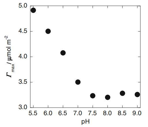 其中CS、R和T分別為表面活性劑總濃度、氣體常數和溫度。由于所有樣品溶液都含有過量的鈉鹽作為緩沖液并保持在恒定pH值,因此i值(濃度隨表面活性劑濃度變化的離子種類數)取為1。圖5中繪制了最大值與pH值的關系圖。最大值在小于7.3的pH值下顯著增加,與cmc/C20比值的值相同。這些結果肯定表明,當pH值降至7.3以下時,在溶液表面用H+替換SLAS的Na+,也就是說,在pH值>7.3時,NDO癸酰基肌氨酸陰離子的反陽離子(LAS?)是空氣-水界面處的所有Na+。因此,估計了H+LAS的pKa值?另一方面,在含水體中,我們根據不同SLAS濃度下的pH值,確定了含水體相中HLAS的pKa值為3.3,該pH值在氮氣鼓泡的去火純水中。雖然我們還無法確定組裝的HLA的確切pKa值,因為尚未獲得HLA的最大值,但毫無疑問,其值大于含水體相中HLA單體的值3.3。一些文獻也報道了自組裝過程中pKa值的增加[12,13]。