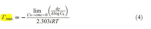 表面活性劑的最大界面過量濃度(Γmax)由吉布斯吸附方程估算如下[11]: