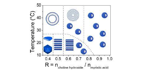 圖1.氫氧化膽堿/肉豆蔻酸體系整體相行為的示意圖,作為R和溫度的函數,根據參考文獻30的先前研究確定。
