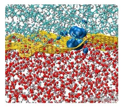 大多數(shù)DFT模擬的計(jì)算要求通常與電子數(shù)的立方成比例。但對(duì)于具有大帶隙特性的絕緣系統(tǒng),僅線性擴(kuò)展的DFT技術(shù)可用于研究電子結(jié)構(gòu)。利用這種方法,哈桑納利和他的同事在納米尺度上模擬了由數(shù)千個(gè)原子組成的疏水界面的電子效應(yīng)。下圖顯示了模擬的油水界面。