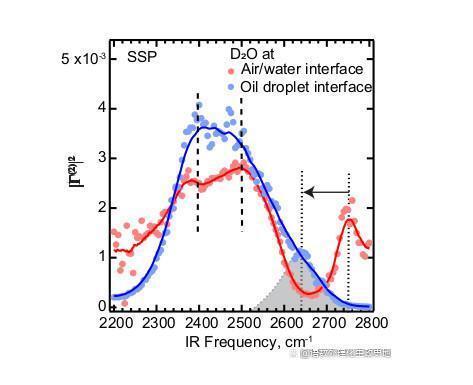 下圖顯示了分散的十二烷油滴(藍(lán)色圓圈)和空氣-水界面(紅色圓圈)的界面水(DO)光譜。(使用重水穩(wěn)定了實(shí)驗(yàn)條件,并將運(yùn)行時(shí)間減少了約40%。)水分子的振動(dòng)頻率偏移部分取決于與相鄰分子氫鍵的強(qiáng)度。2400 cm^-1和2500 cm^-1處的垂直虛線標(biāo)記了氫鍵影響水的氧-氘鍵的頻率邊界。兩個(gè)接口的峰值頻率范圍大致相同。