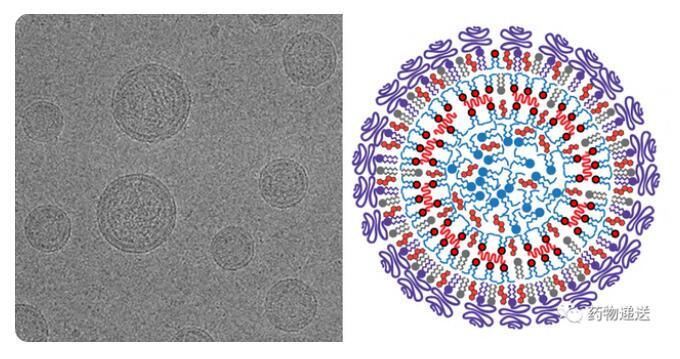 以2018年8月10日FDA批準的Onpartro(Patisiran)為例,其作為首款采用LNP遞送siRNA的產品,是諾貝爾獎成果從概念走向臨床實際應用的里程碑。LNP-siRNA遞送系統是通過快速混合溶解脂質的乙醇溶液和pH=4.0的siRNA水性緩沖液,然后透析去除藥液中乙醇并調節pH=7.4,形成LNP-siRNA。通過低溫透射電鏡觀察到,LNP對核酸物質的包載效率接近100%,內部電子密度均勻。分子模型和實驗數據表明,LNP是具有包含核酸物質核心的納米結構。