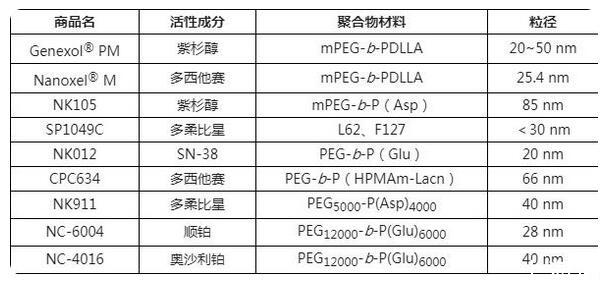 Genexol PM以聚乙二醇-聚乳酸(mPEG-b-PDLLA)為載體材料,粒徑在20~50nm,不使用聚氧乙烯菌麻油(Cremophor EL)降低發生嚴重過敏性反應的可能性;Paclical則使用新型輔料XR-17(維生素A的類似物),XR-17能與水溶性物質形成膠束,包裹紫杉醇后能自組裝形成粒徑在20~60nm的膠束,將包載的藥物分子遞送至靶標后,輔料在體內被快速代謝清除。