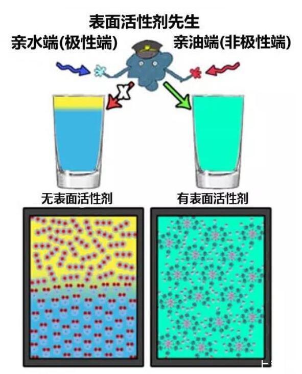 表面活性劑(surfactant)指的是一類能夠降低液體表面張力的化合物,是一種“兩親”分子,既能和水分子親熱,也能和油分子親熱。