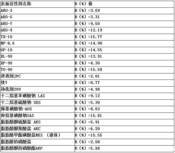 R值越大,表明凈洗能力越強(qiáng),該測(cè)試標(biāo)準(zhǔn)可用來(lái)表征表面活性劑對(duì)一般污垢的去除,不適用于反映油脂和蠟質(zhì)的去除能力。