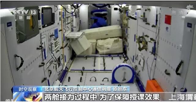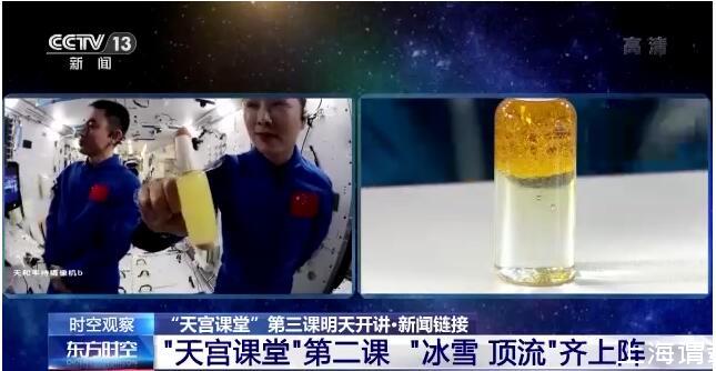 在約45分鐘的授課中,航天員演示了微重力環(huán)境下太空“冰雪”實(shí)驗(yàn)、液橋演示實(shí)驗(yàn)、水油分離實(shí)驗(yàn)、太空拋物實(shí)驗(yàn),講解了實(shí)驗(yàn)現(xiàn)象背后的科學(xué)原理,還展示了部分空間科學(xué)設(shè)施。