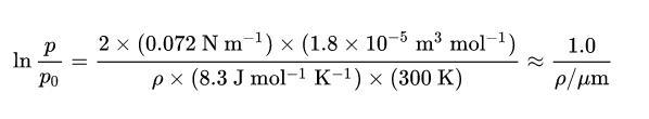 聽說公式會(huì)讓人不想看科普所以我只講這一個(gè)公式好了(x)其中,R是通用氣體常量,T是溫度,ρ是液滴表面的曲率半徑。p?是表面平整的液體原本的蒸氣壓,p是這個(gè)液滴的蒸氣壓。p?、表面張力γ、液體摩爾體積V_m對(duì)于同種溫度的同種液體可以認(rèn)為近似是常量。把以上常量合并為常量C,所以在同樣溫度下,對(duì)于同種液體,可以得出如下的半定量關(guān)系: