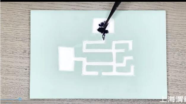 玄機主要在于后面滴加的染色液體上。可以看出,這個液體加到迷宮起點之后是會自動選擇“正確的道路”來前進的。雖然液體加太多之后會溢出到其他死胡同的方向,但是液體前端剛剛到達分岔路的時候,可以明顯地看到一個選擇性拐彎的趨勢,就像下面的動圖這樣: