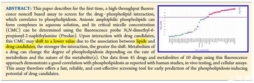 本文首次描述了一種與磷脂質相關的高通量熒光。陰離子兩親磷脂可以在水溶液中形成復合物,其臨界膠束濃度(CMC)可以使用熒光探針N,N-二甲基-6-丙酰-2-萘胺(Prodan)測定。在與候選藥物相互作用時,由于脂質和候選藥物之間的關聯,該CMC可能會轉變為較低的值,相互作用越強,轉變越大。藥物的代謝可以根據代謝速率和代謝物的性質改變磷脂質的程度。我們使用這種熒光方法從45種藥物和10種藥物的代謝物獲得的數據證明了與人體研究、體內測試和細胞分析報告的磷脂沉積癥有良好的相關性。因此,該測定提供了一種快速、可靠且具有成本效益的篩選工具,用于早期預測候選藥物的磷脂沉積誘導潛力。