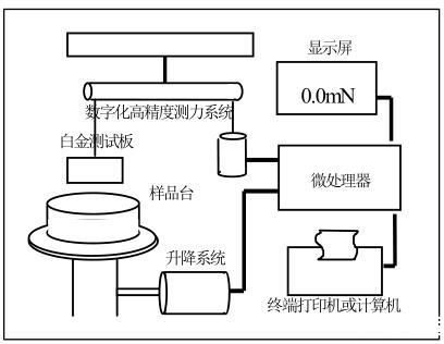 當(dāng)白金板接觸到樣品液后,樣品液的表面張力會(huì)將白金板往下拉。基于高精度電子天平的數(shù)字化檢測系統(tǒng)檢測到這個(gè)微小的力并傳到微處理機(jī)進(jìn)行處理。