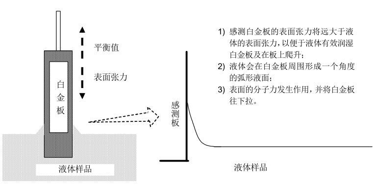 當(dāng)感測白金板浸入到被測液體后,白金板周圍就會(huì)受到表面張力的作用,液體的表面張力會(huì)將白金板盡量地往下拉。當(dāng)液體表面張力及其他相關(guān)的力與平衡力達(dá)到均衡時(shí),感測白金板就會(huì)停止向液體內(nèi)部浸入。這時(shí)候,儀器的平衡感應(yīng)器就會(huì)測量浸入深度,并將它轉(zhuǎn)化為液體的表面張力值。
