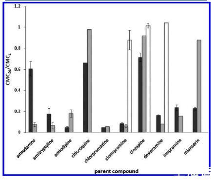 圖5.CMC偏移(由CMC之間的比率表示)藥物-脂質復合物(DL)和單獨脂質的CMC(L):CMCDL/CMCL)的測試化合物(黑色)及其主要代謝物(灰色、初級代謝物;白色,次生代謝物)在pH 7.2中分析HEPES緩沖液。使用的藥物濃度為1 mM,除非另有說明見表2。誤差線被分配給那些n g3測試的化合物。對于氯氮平和米安色林,均為0.91和0.091 mM用于測試,但僅來自1 mM測試的數據被策劃。